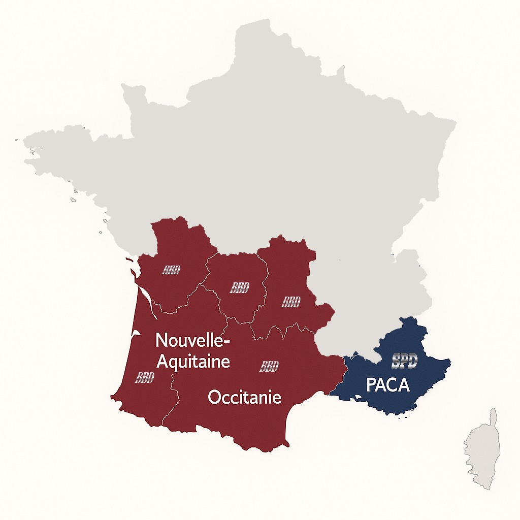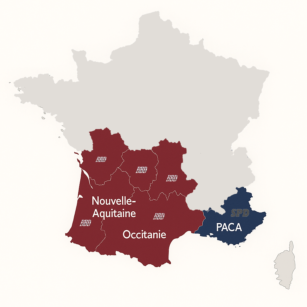 Notre présence s’étend sur les régions Occitanie, Nouvelle-Aquitaine et PACA, en partenariat avec la société SPD Services*, basée à Villeneuve-Loubet.